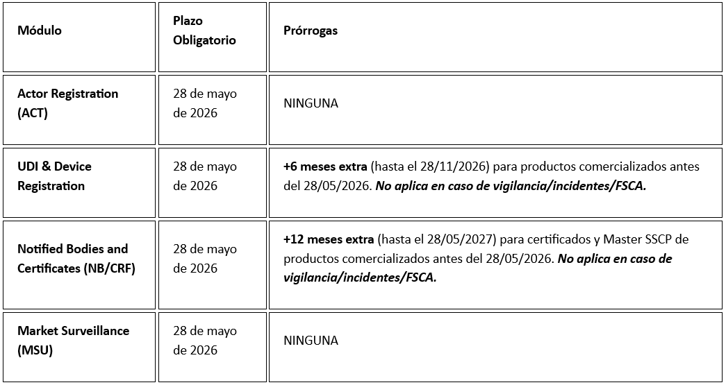 - Los Organismos Notificados tienen una prórroga de 12 meses extra (hasta el 28 de mayo de 2027) para registrar en el módulo NB/CRF los certificados emitidos y los Master SSCP (para clases IIb/III) relativos a los productos introducidos en el mercado antes del 28 de mayo de 2026.